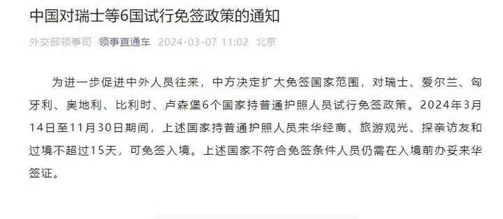 外交部领事司7日发布:为进一步促进中外人员往来,中方决定扩大免签国家范围,对瑞士、爱尔兰、匈牙利、奥地利、比利时、卢森堡6个国家持普通护照人员试行免签政策。