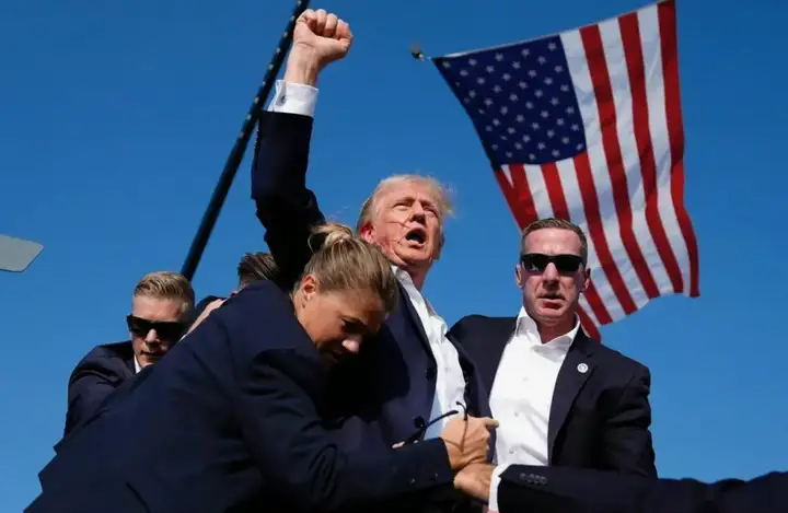 在特勤局特工的紧急护送下,他被迅速带离了演讲台。在被护送至安全区域的过程中,尽管特朗普的面部和右耳都沾满了血迹,但他依然挥舞着拳头,向在场的群众展示了他的精神。这一勇敢的举动不仅强化了他作为“个人英雄”的形象,还在短期内显著提升了他的支持率。